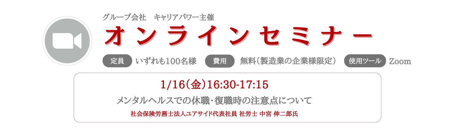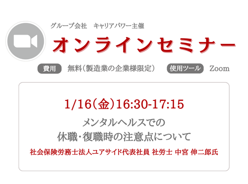 【2026年1月16日(金)16:30-17:15】メンタルヘルスでの休職・復職時の注意点について 講師:社会保険労務士法人 ユアサイド代表社員 社労士 中宮伸二郎氏 休職指示や復職判断・休職期間満了の扱いについてご紹介します。 定員100名様 参加無料